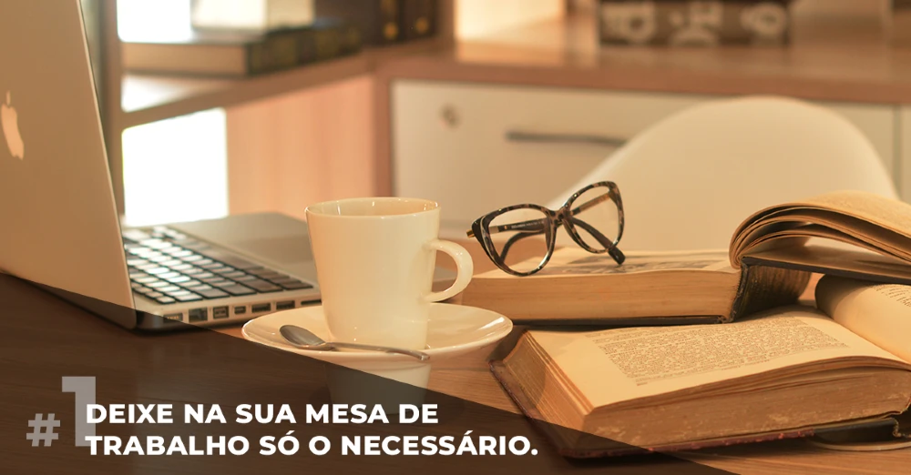 Para você conseguir manter sua mesa sempre limpa e organizada, elimine os objetos que estão sobrando, como bonecos colecionáveis, porta-retratos e canetas que você não utiliza. Além disso, dê lugares fixos aos objetos que você irá manter. Por exemplo, deixe o porta lápis sempre ao lado direito, a caixa de clipes ao lado esquerdo e assim por diante. Esses pequenos detalhes irão economizar o seu tempo durante o dia.