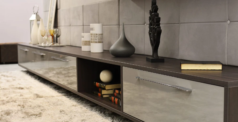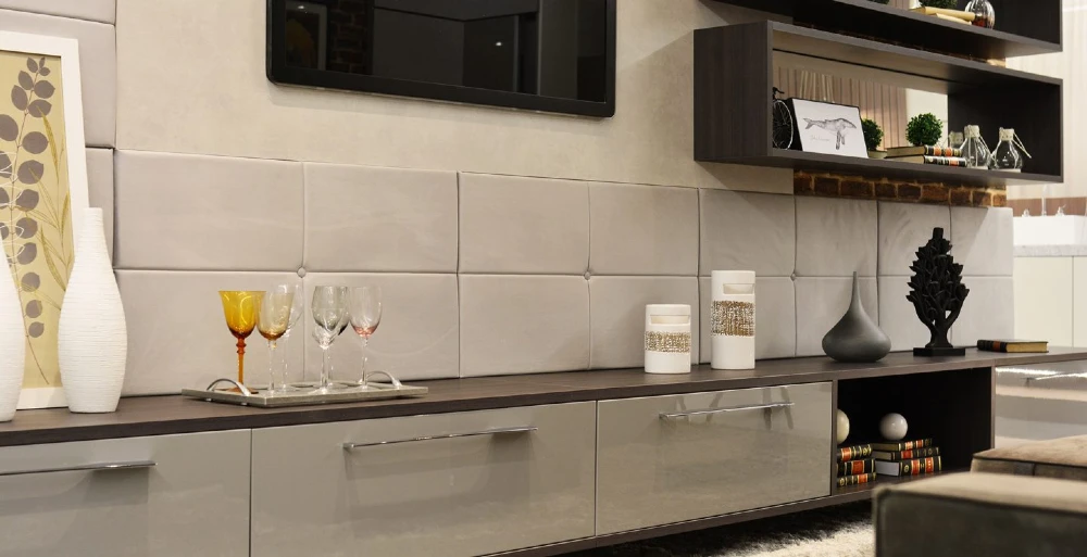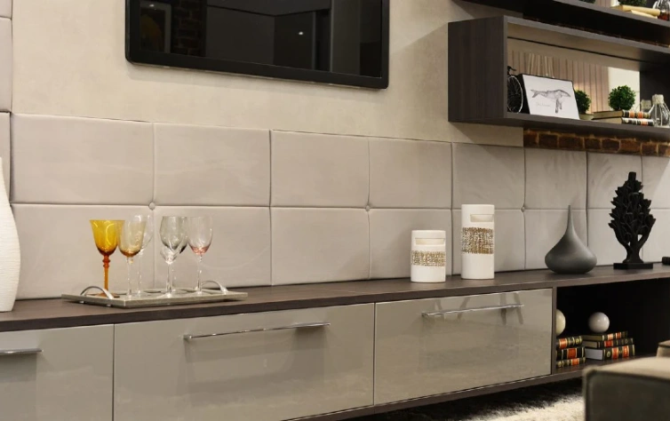 Se você estiver se mudando para um apartamento pequeno, não tem problema! Trouxemos uma inspiração de sala perfeita para esta situação! Neste projeto, apresentamos uma paleta de cores mais frias, e para não perder o conforto, apostamos em um home theater com a parede acolchoada e em um tapete em pelúcia.