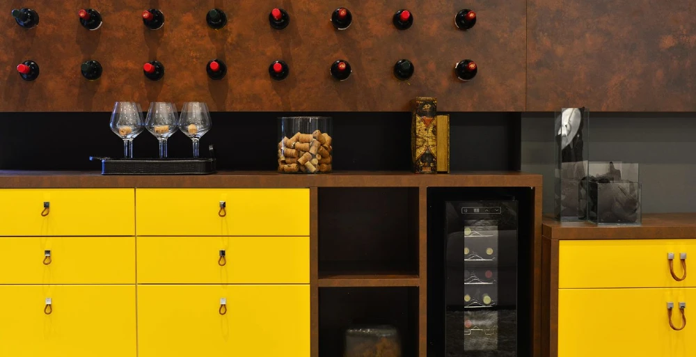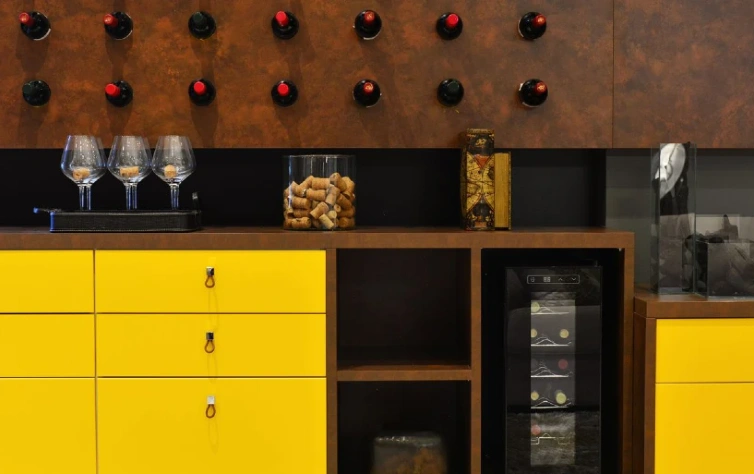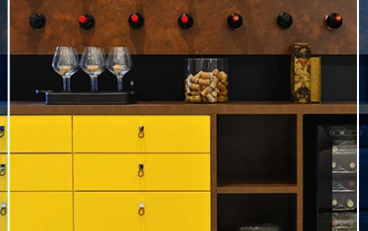 Se você optar por um padrão mais escuro no planejado, escolha uma cor chave para contrastar. As gavetas e gavetões amarelos, por exemplo, foram essenciais para deixar esse ambiente mais vivo. Optamos por puxadores delicados em Oppus Couro que, além de cumprirem um papel, servem como complemento da decoração.
