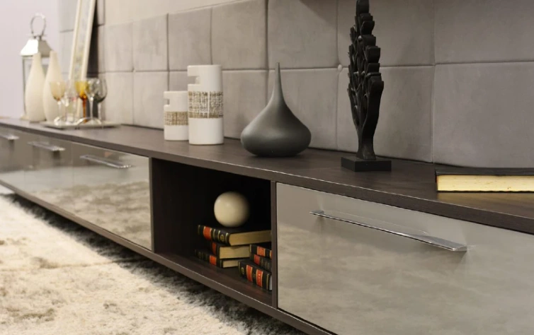 Para finalizar, esse aparador com gavetões foi fundamental para reforçar a sensação de amplitude do cômodo, já que se estende do início ao fim da sala. Bastou alguns objetos de decoração – da mesma paleta de cores – para ocupar o espaço de forma equilibrada.