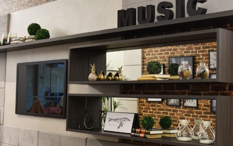 Assim como no outro projeto, alguns objetos foram essenciais para demarcar a personalidade do morador. Mas, diferente da outra opção, essa sala possui nichos aéreos, já que o ambiente é bem menor. Desse jeito, você aproveita o espaço que tem, sem perder a chance de decorar como deseja. A estante no topo do móvel deu uma sensação de amplitude na parede e os tijolos à mostra trouxeram um estilo mais moderno para a decoração.