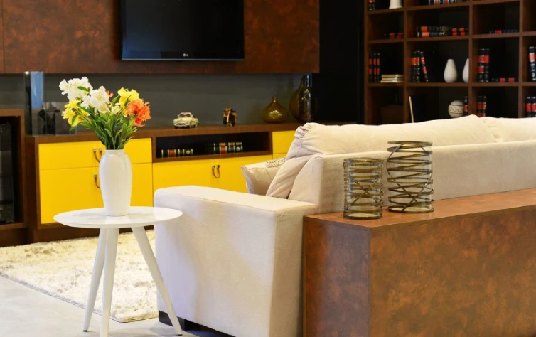 O sofá é o protagonista do ambiente, por isso você precisa que ele seja bem aconchegante – almofadas também ajudam nessa hora. Neste projeto da Italínea, de estilo mais moderno, foram escolhidas cores mais quentes para os móveis e, neste caso, o sofá veio como um neutralizador da paleta, já que trouxe um tom bem mais claro no centro do ambiente.