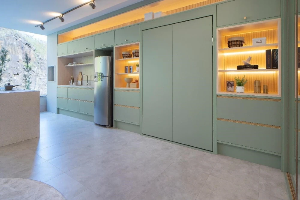 Outra possibilidade é a cama embutida, que pode ser recolhida e virar parede durante o dia.
