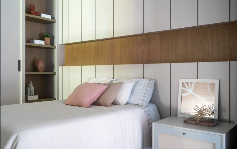 Um guarda-roupa ou armário planejado é crucial para manter o ambiente organizado. Em um dormitório de casal, os armários planejados podem incluir divisórias específicas para cada pessoa, facilitando a organização. Opções como portas de correr, espelhos e iluminação interna podem ser incorporadas para otimizar ainda mais o espaço. Para dormitório de solteiro, optar por um armário embutido pode liberar mais área útil para outras atividades.