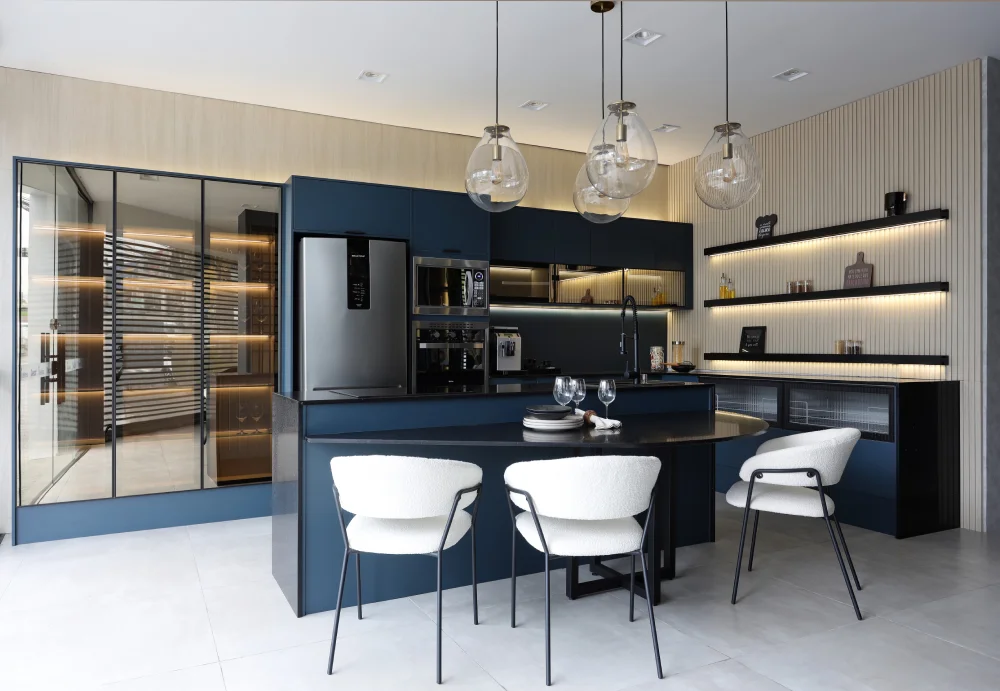 Uma cozinha planejada com armários azuis e eletrodomésticos em inox cria um visual sofisticado e moderno.