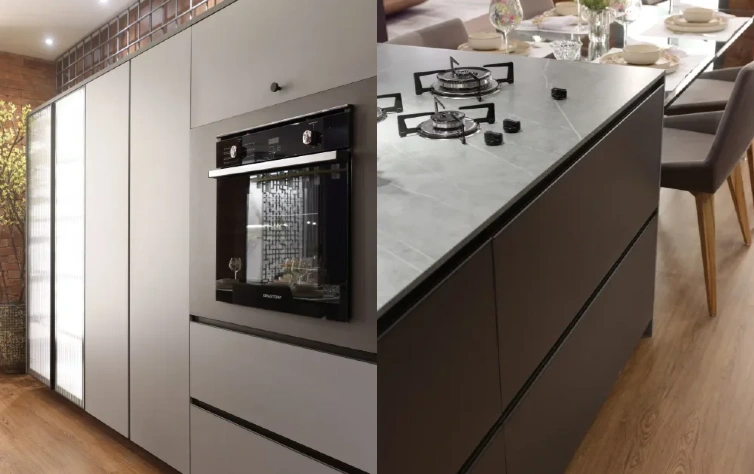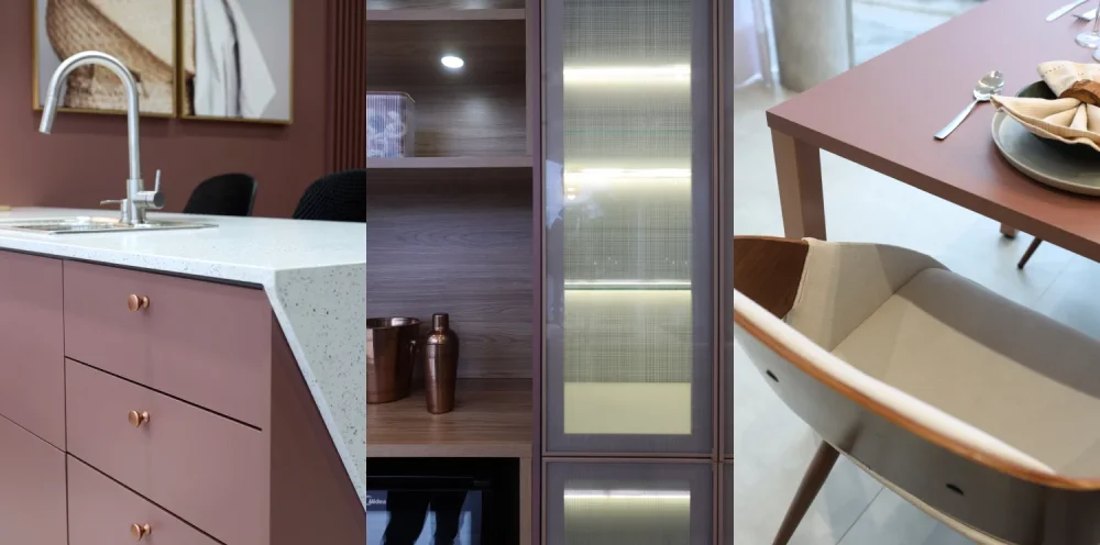 Além das cores, os materiais também desempenham um papel importante. Eletrodomésticos de inox, vidro ou até acabamentos em plástico de alta qualidade devem complementar os materiais dos móveis, como MDF, laca ou madeira natural.