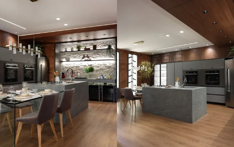 Armários cinza e ilha com acabamento em pedra, combinados com eletrodomésticos pretos, criam uma atmosfera elegante e contemporânea.