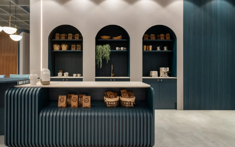 Nas salas de estar, o revestimento PET é empregado em painéis de parede e estantes, oferecendo acabamentos elegantes e duráveis que são leves e fáceis de instalar.