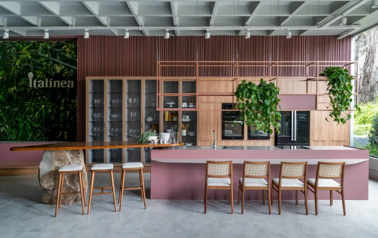 - Prateleiras abertas: permitem expor louças, utensílios decorativos e plantas, tornando o ambiente mais convidativo.
