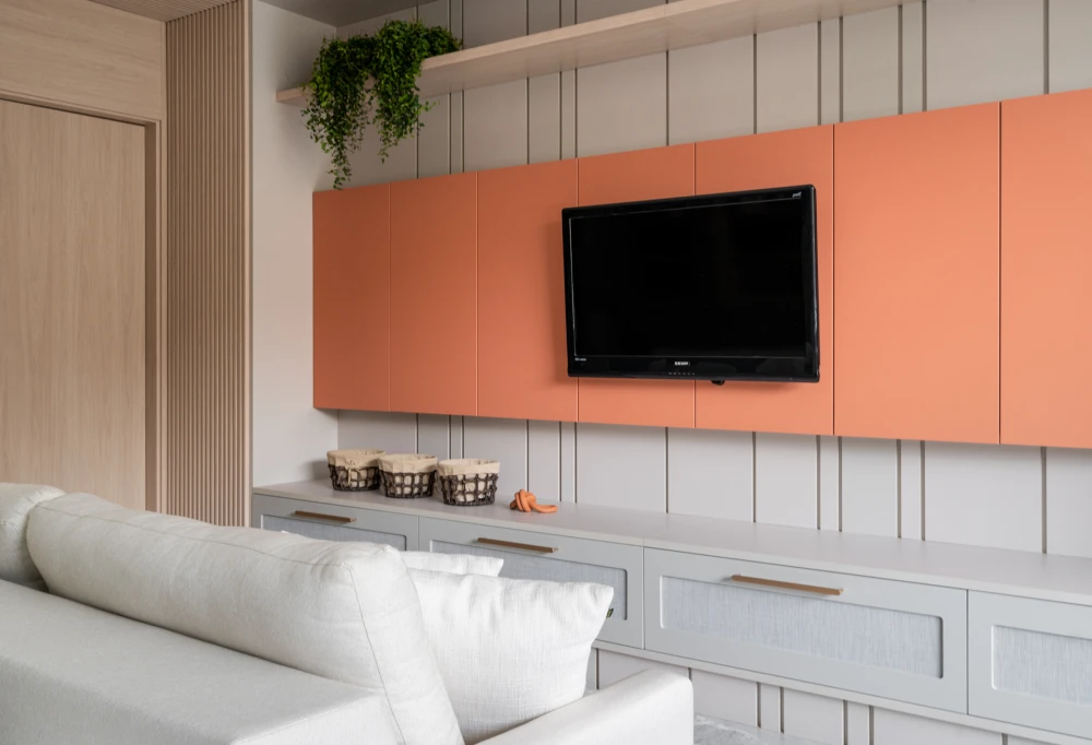 A pintura em laca é uma técnica de acabamento que envolve a aplicação de tinta no painel do móvel, proporcionando um resultado uniforme, liso e, dependendo da escolha, com brilho intenso ou acetinado. Ela é muito utilizada em móveis planejados de diferentes ambientes, como cozinhas, banheiros, salas e quartos, por seu apelo estético e toque de modernidade.