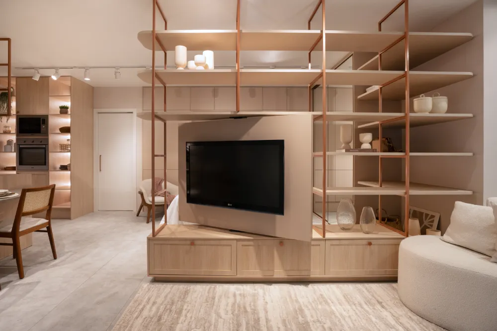 Com soluções de armazenamento inteligentes e mobiliário multifuncional, é possível criar áreas distintas dentro desse estilo sem comprometer a sensação de amplitude.