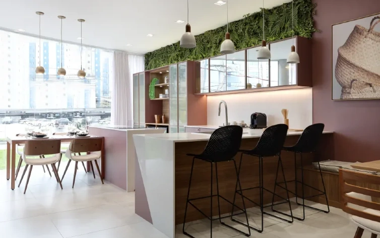 Na cozinha, o aproveitamento do espaço vertical é essencial. Armários altos e o uso de organizadores dentro dos armários podem maximizar o armazenamento sem comprometer a funcionalidade.