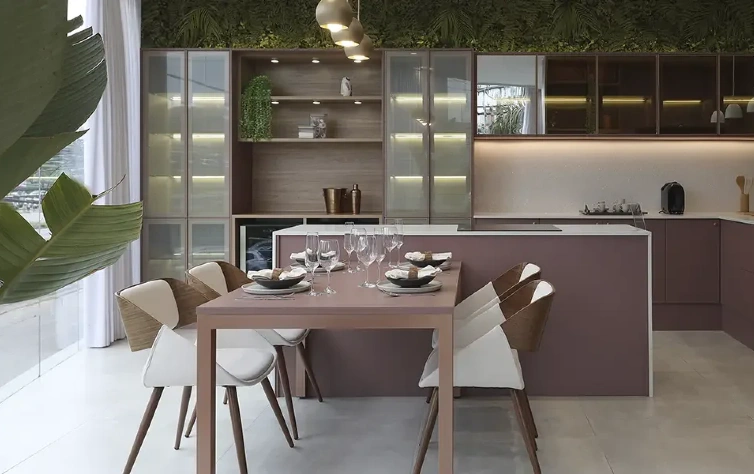 As paletas de cores evoluem para tons neutros mais quentes e naturais. A cor Pantone 2026 surge como complemento pontual, aplicada em painéis, nichos ou detalhes do mobiliário, reforçando identidade sem comprometer a flexibilidade do projeto ao longo do tempo.